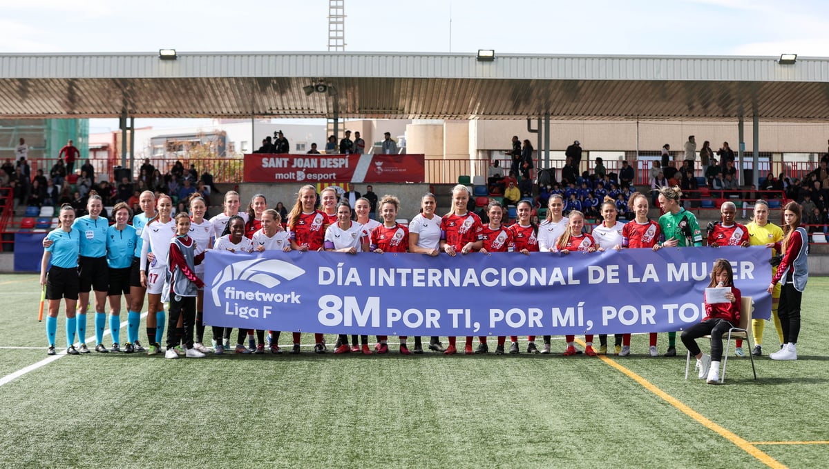 Incidencias: Partido correspondiente a la vigesimoprimera jornada de la Finetwork Liga F disputado en el Municipal de Las Planas. Ambos equipos posaron juntos en los prolegómenos del encuentro con una pancarta por el Día de la Mujer.