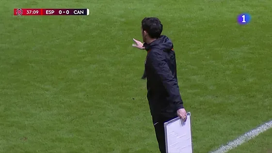 Una de las imágenes del encuentro llegó desde la banda cuando el seleccionador canadiense, el británico Andy Spence, aprovechó también para 'probar' cosas y es que desde su zona técnica mostró una pizarra de grandes dimensiones para darle indicaciones a sus jugadoras.