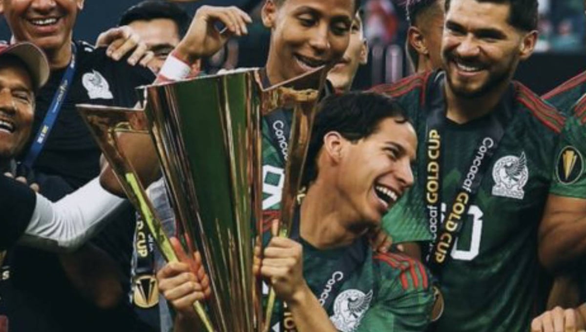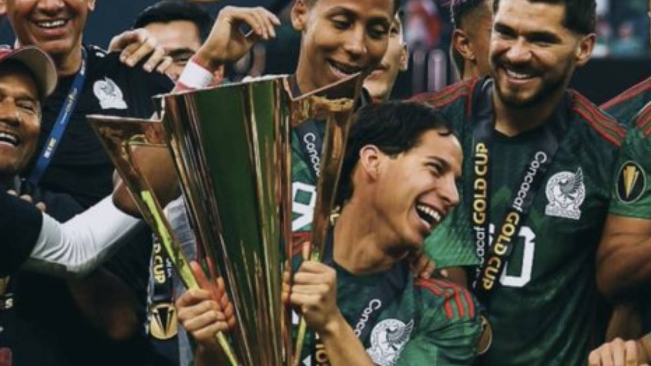 Diego Lainez levantando con México la Copa Oro 2023.Twitter / Diego Lainez
