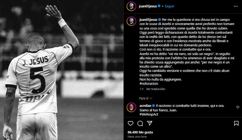 Después de que este lunes Francesco Acerbi, jugador del Inter, negara los insultos racistas al brasileño Juan Jesus, jugador del Nápoles, éste último insistió en que el interista le llamó "negro" en dos ocasiones. "Leo unas declaraciones de Acerbi totalmente contradictorias con la realidad de los hechos, con lo que él mismo dijo ayer sobre el terreno de juego y con la evidencia también de vídeos y labios inequívocos en los que me pide perdón. Así que no estoy de acuerdo. El racismo es se está peleando aquí y ahora", publicó en su cuenta de Instagram.