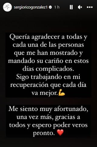 Y ahora ha sido el propio Sergio Rico el que ha dado un paso más y tras semanas siendo su mujer la que informaba por redes sociales, hoy ha sido el portero de Montequinto el que, a través de su cuenta de Instagram, ha publicado una 'storie' con el siguiente mensaje: "Quería agradecer a todas y cada una de las personas que me han mostrado y mandado su cariño en estos días complicados. Sigo trabajando en mi recuperación que cada día va mejor. Me siento muy afortunado, una vez más, gracias a todos y espero poder veros pronto".