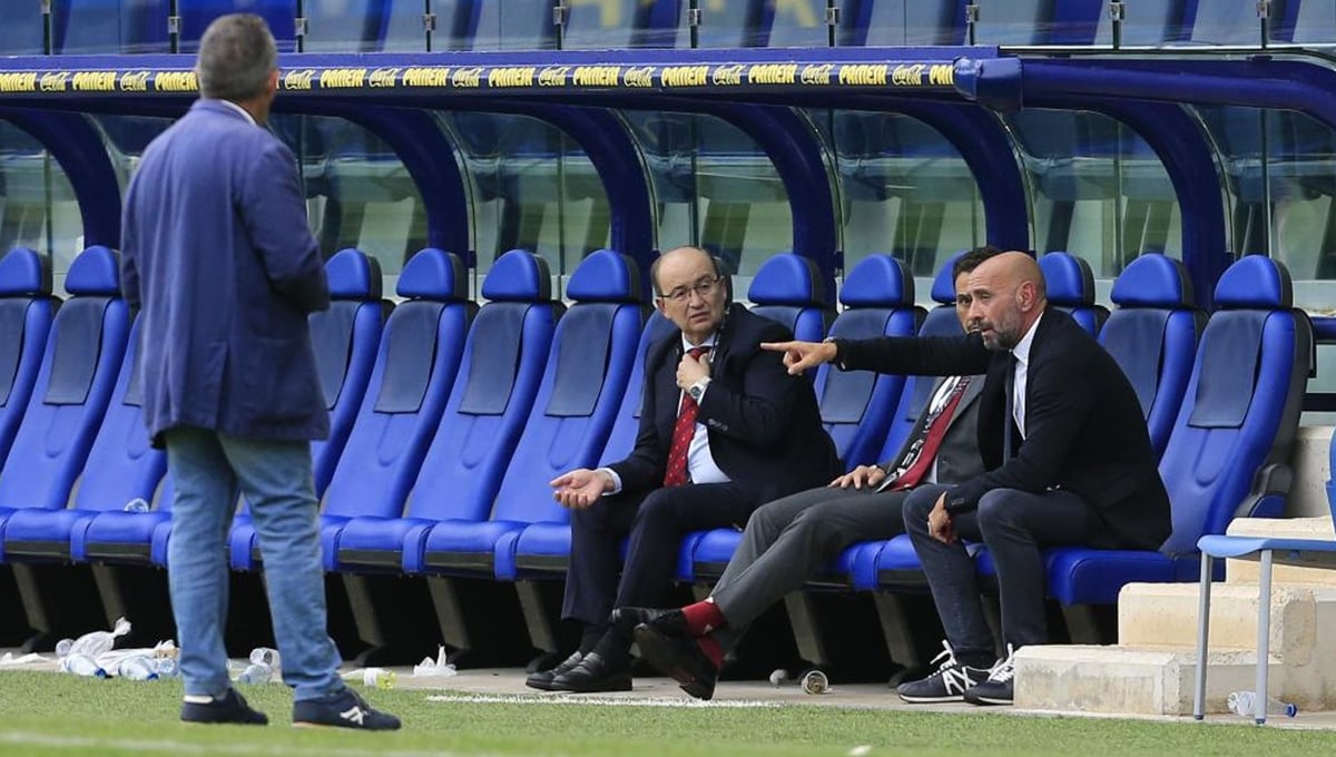 Monchi, director deportivo del Sevilla, junto al presidente Castro y el vicepresidente Del Nido Carrasco. UES
