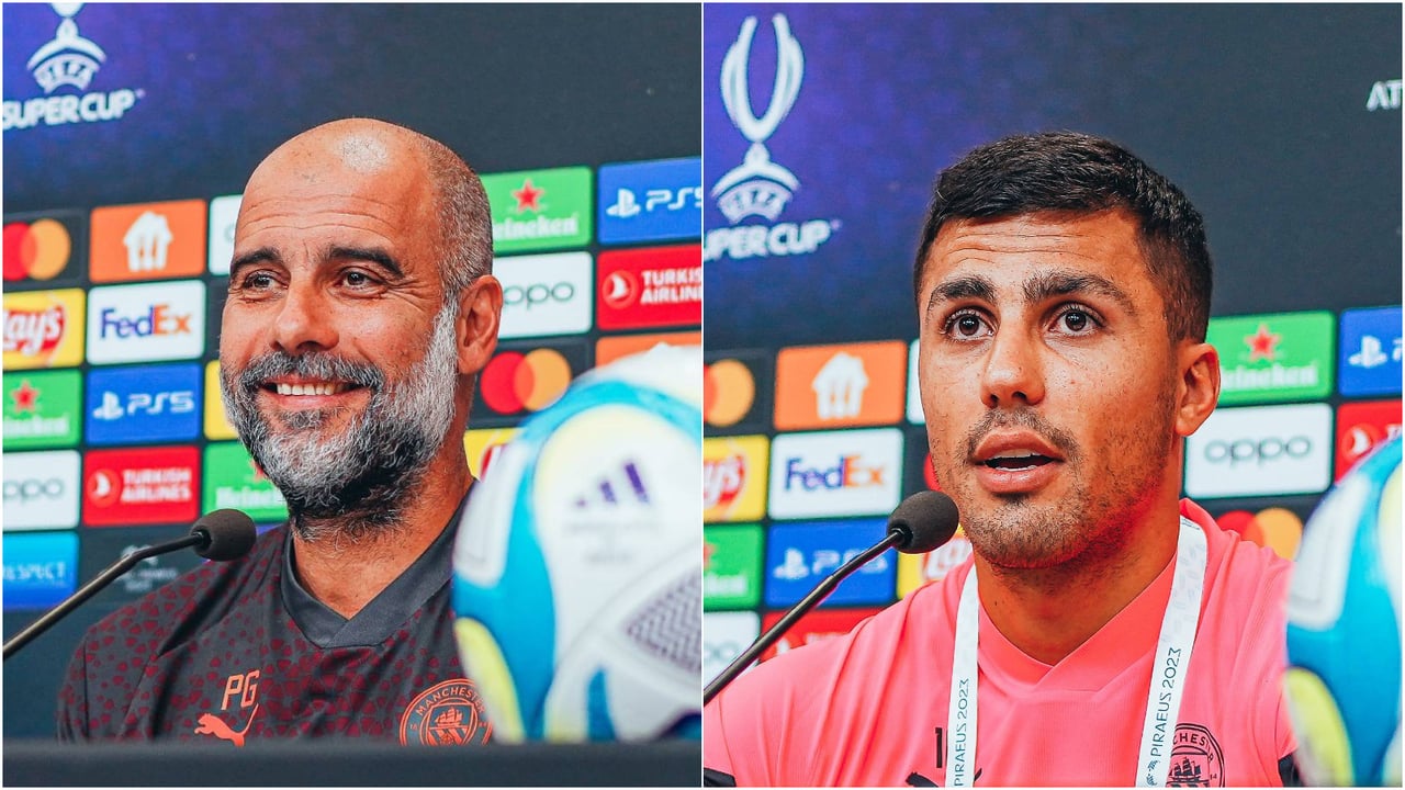 Guardiola y Rodri, durante la rueda de prensa previa a la final contra el Sevilla.Twitter / Manchester City