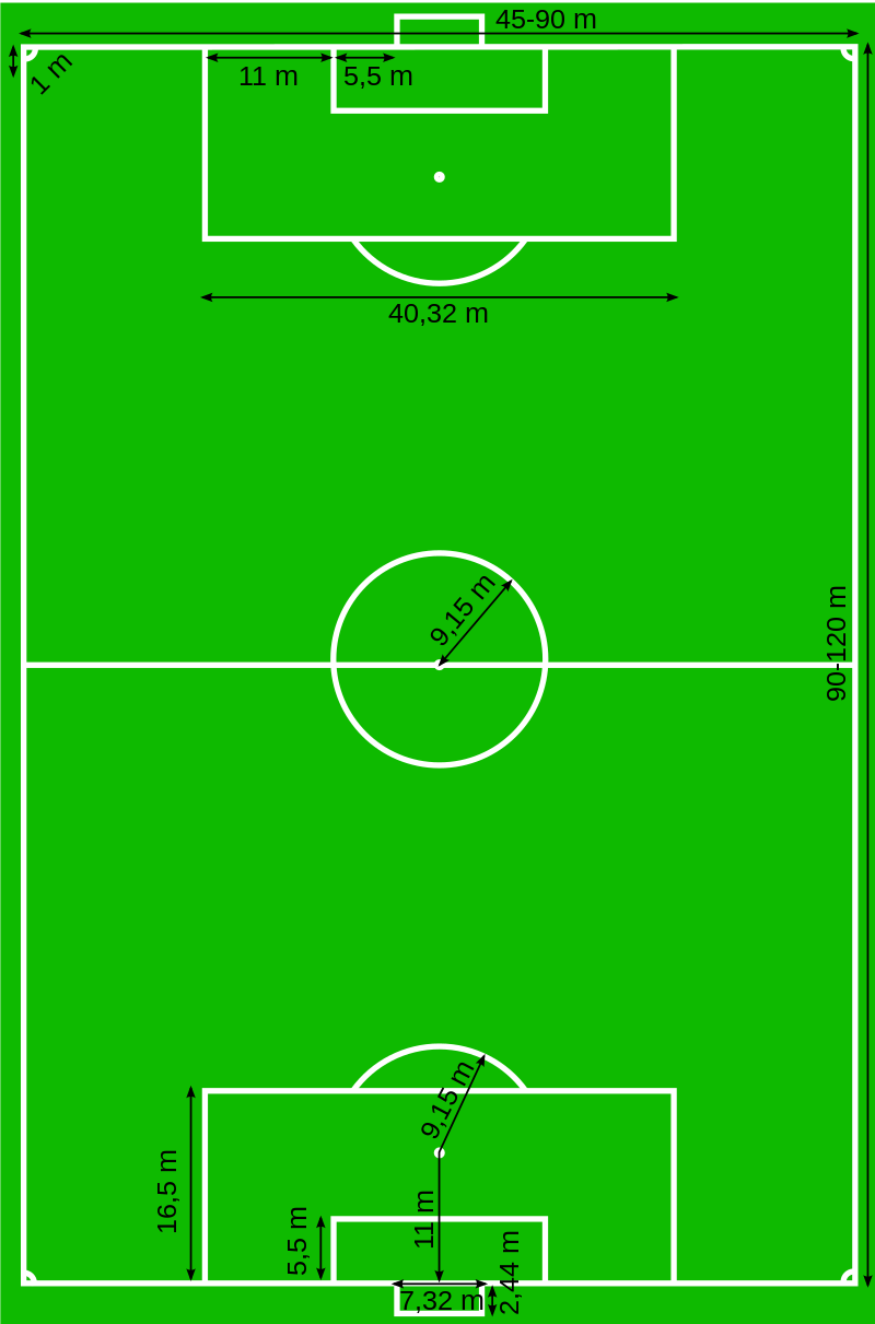 Según la Regla número 1 de la IFAB dice que la longitud de la línea de banda debe ser superior a la de la línea de meta, existiendo un mínimo de 90 metros (100 yardas) para la banda y un máximo de 120 metros (130 yardas). En lo referente a la línea e meta, debe existir un mínimo de 45 metros (50 yardas) y un máximo de 90 metros (100 yardas).