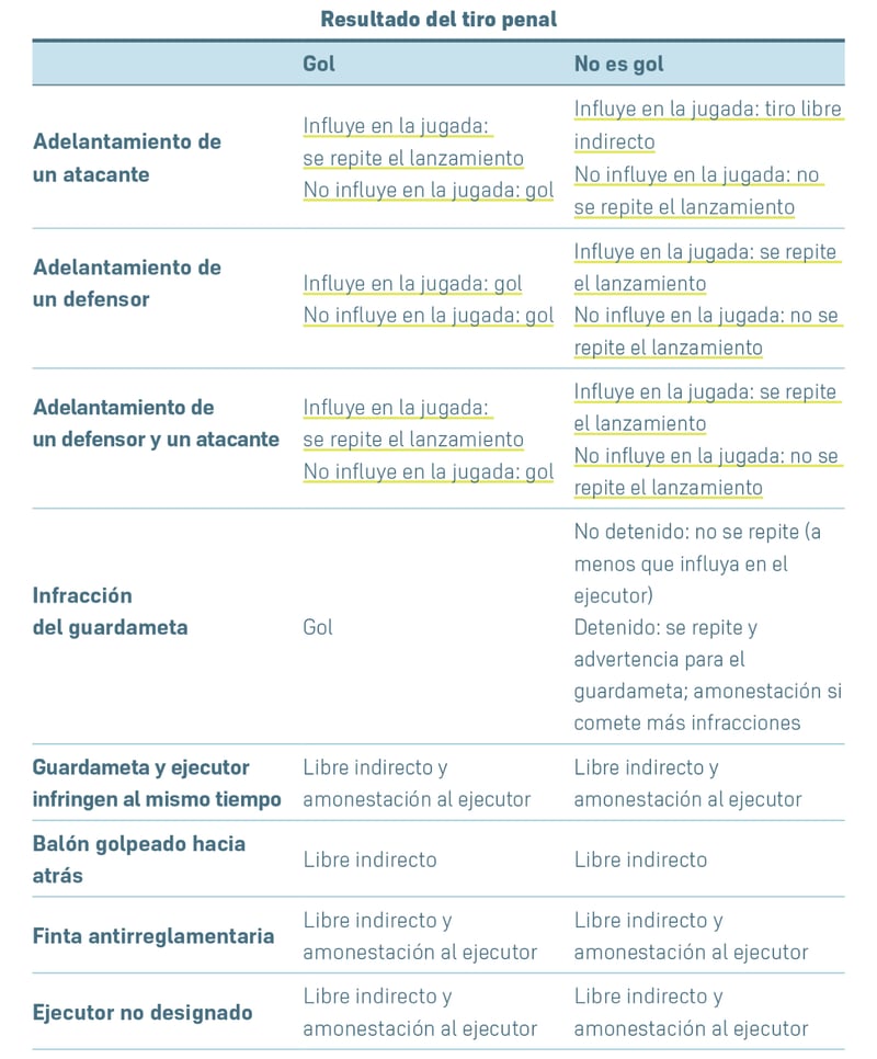 - Cuando un compañero de equipo del guardameta comete una infracción: si el balón entrara en la portería, se concederá gol; si el balón no entrara en la portería, se repetirá el tiro penal.