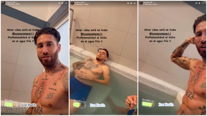 Ambos jugadores se meten de lleno en una piscina de agua helada clásica para recuperar los músculos tras la sesión de entrenamientos. Algo que el argentino parece no llevar muy bien y que Ramos aprovecha para bromear: "Mirad cómo está mi Indio, Lucas Ocampos. Profesionalidad el bicho en el agua fría", escribió el camero revelando el apodo de su compañero en el vestuario.