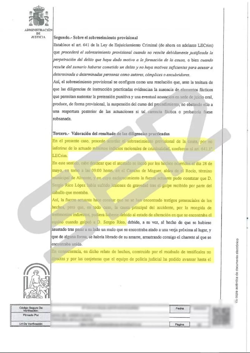 El presentador del programa radiofónico, Yago de Vega, explicaba que "muchos de los testigos vieron las consecuencias, es decir, a Sergio Rico en el suelo tras el brutal accidente, pero que, sin embargo, no el momento de los hechos". Además, 'El Larguero' informaba que el juez del juzgado número 2 de la Palma del Condado ha decidido sobreseer el caso.