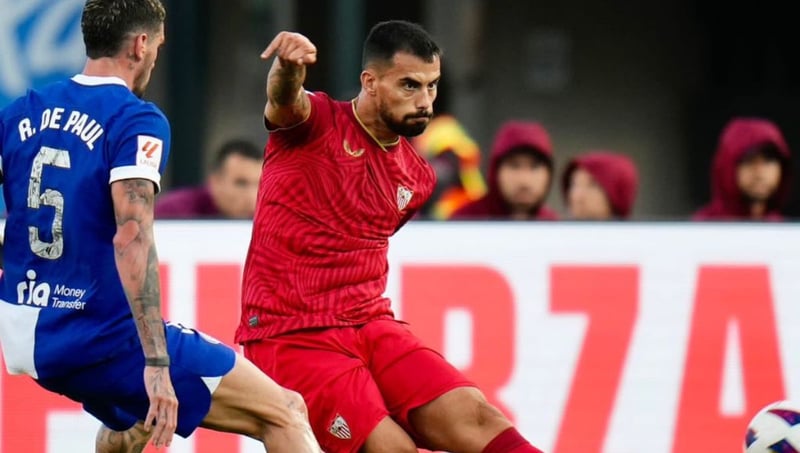 Amarilla para Soyuncu por frenar a Pedrosa, que se escapaba por la izquierda; falta peligrosa en un lateral a favor del Sevilla