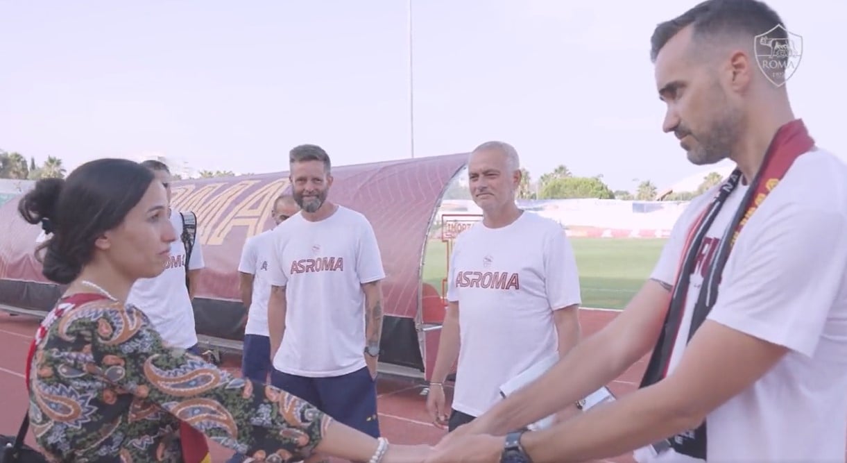 Justo antes del comienzo del entrenamiento de la Roma, con el equipo en vestuarios y solo el cuerpo técnico en el terreno de juego, se produjo el momento que sorprendió sobremanera a José Mourinho. Una pedida de matrimonio entre dos hinchas del conjunto romano que desató los aplausos entre los presentes.
