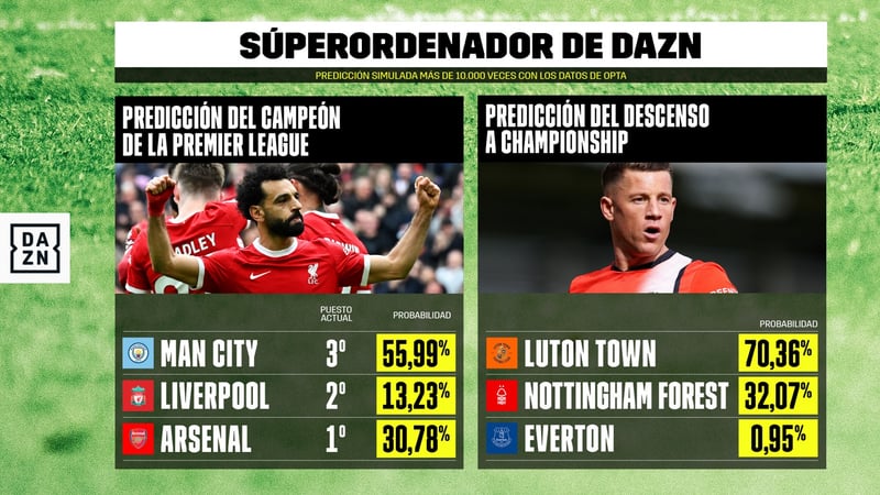 La plataforma de streaming deportivo DAZN ha simulado a través de su superordenador las cuatro jornadas y media restantes de Premier League. El mismo augura que, pese a que el Manchester City sigue siendo el máximo favorito para ganar la liga con un 55.99%, los gunners vuelven a ser firmes candidatos al título. Tras caer ante el Aston Villa hace dos semanas y la racha de tres victorias consecutivas de los sky blues, la herramienta de predicción de DAZN, que simula con datos de Opta más de 10.000 veces los encuentros restantes de liga, da un 30.78% de probabilidad al Arsenal de llevarse la Premier League.