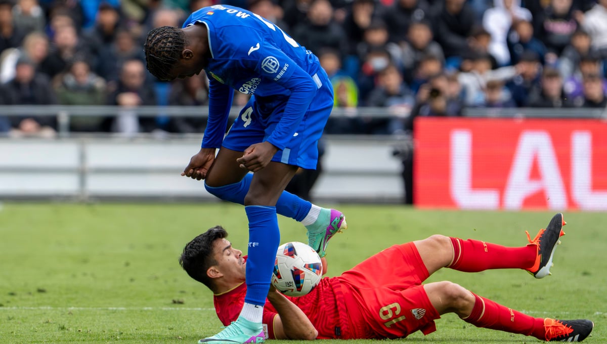 Ilaix Moriba pugna con Marcos Acuña durante la última visita nervionense a Getafe.CORDON PRESS