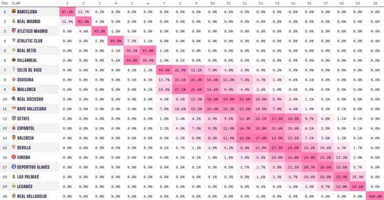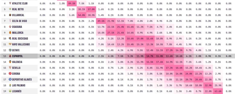 Los dos equipos que actualmente ocupan puestos de descenso, Leganés (19º) y UD Las Palmas (18º) evidentemente cuentan con mayores opciones de descender que el resto. De esta forma, el superordenador predice para el Leganés un 63,6% de posibilidades de quedar en penúltima posición y un 22% de ser el antepenúltimo. Pocas esperanzas de salvación ahora mismo para los pepineros, pues tan sólo tienen un 8,7% de acabar decimoséptimo y por tanto, fuera del descenso.