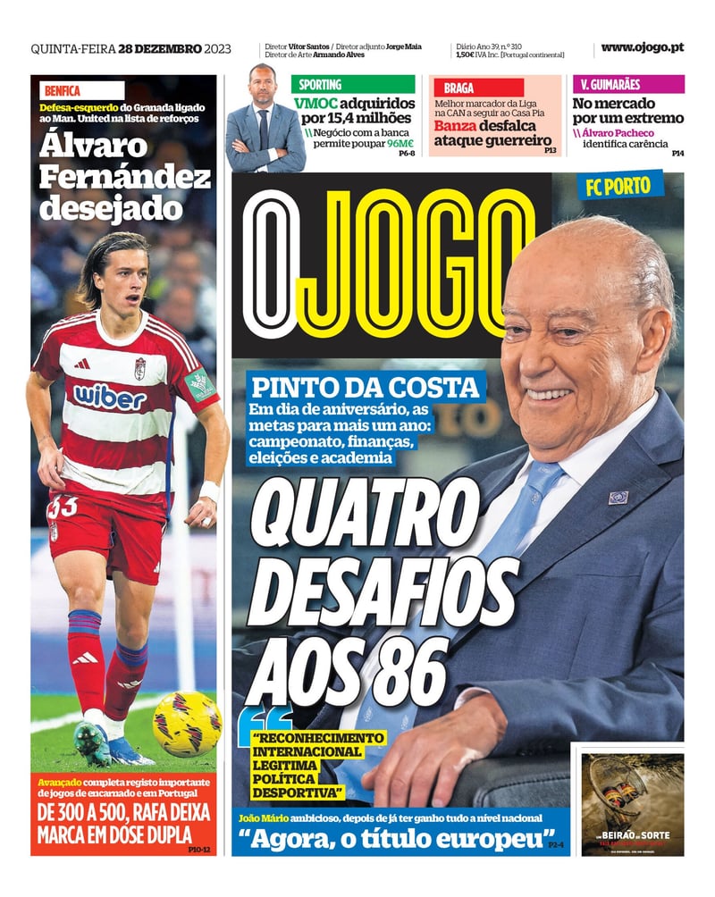 En lo que arranca la competición en 2024 para el Granada, el mercado de fichajes ya habrá echado a rodar. Antes de que esto suceda, ya empiezan a salir nombres y el Granada no está exento de participar en este baile. Así, desde el diario de la vecina Portugal, O Jogo, en su portada de este jueves 28 de diciembre informa sobre que el Benfica, estaría interesado en hacerse con los servicios de Álvaro Fernández, zaguero que actualmente juega en el conjunto nazarí y al que llegó el pasado verano procedente del Manchester United.