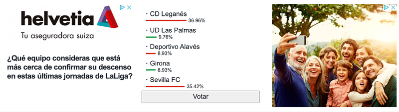 Así lo muestran los datos de la Encuesta Helvetia de hoy en ESTADIO Deportivo. Casi el 37% de los votos señalan a que el CD Leganés está más cerca de confirmar su descenso. Los pepineros son penúltimos y en esta última jornada no pudieron pasar del empate frente al Sevilla FC en el Ramón Sánchez-Pizjuán. Era una opción única para ambos, que finalmente desaprovecharon. Y eso que el canterano Diomandé tuvo en sus botas la oportunidad de certificar el triunfo del cuadro madrileño tras un error de Nyland.