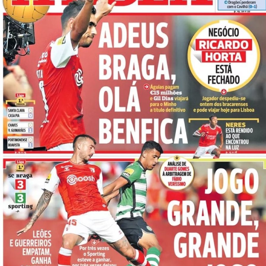 Ricardo Horta está vendido, a falta de confirmación oficial, por el Sporting de Braga al Benfica. Según adelanta A Bola, medio de comunicación deportivo de Portugal, en su portada de hoy los dos clubes ya han llegado a un entendimiento casi total para el traspaso de Ricardo Horta. El Benfica pagará de inmediato 15 millones de euros, transfiriendo también los derechos deportivos de Gil Dias al Sporting de Braga. El acuerdo se está puliendo para que no haya ningún problema, pero el destino de Ricardo Horta está escrito.