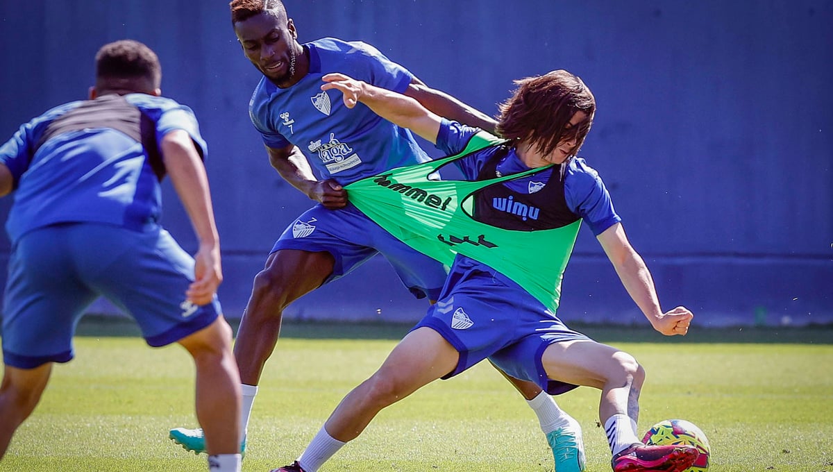 Disputa de un balón durante el entrenamiento@MalagaCF