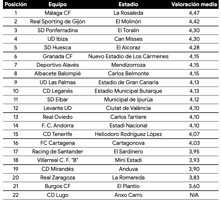 En lo que respecta a LaLiga SmartBank, el del Málaga CF (La Rosaleda) es el estadio de Segunda División mejor valorado por los internautas, seguido por El Molinón (Real Sporting de Gijón) y El Toralín (SD Ponferradina). Y es que, aunque empatado con Can Misses (UD Ibiza), El Toralín tiene más valoraciones y por eso aparece en tercer lugar.