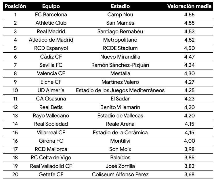 En Primera, la tabla refleja que el Camp Nou (FC Barcelona) es el estadio mejor valorado de España, seguido por San Mamés (Athletic Club) y el Santiago Bernabéu (Real Madrid). Y es que, si bien el Camp Nou y San Mamés empatan en su valoración media, el primero tiene siete veces más valoraciones que el segundo, razón por la que la página autora del estudio lo ha colocado en primera posición.