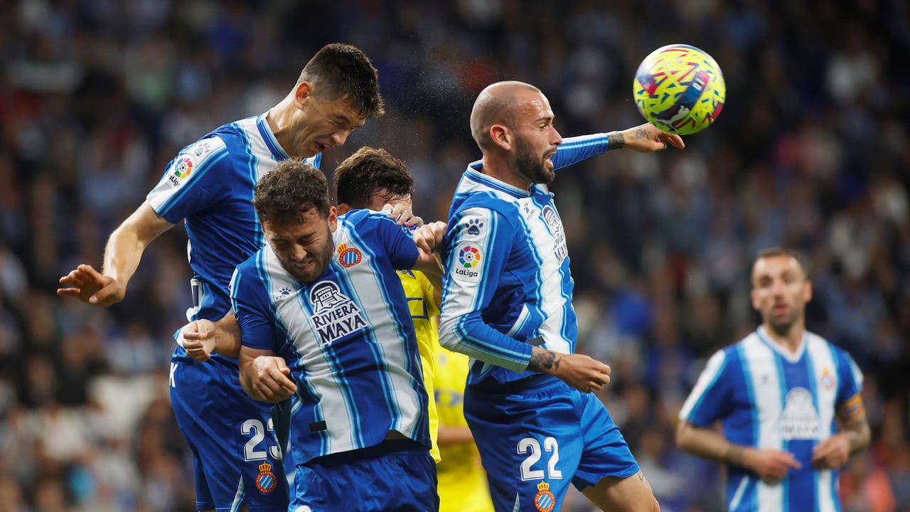 Varios jugadores del Espanyol intentan despejar el balónUES