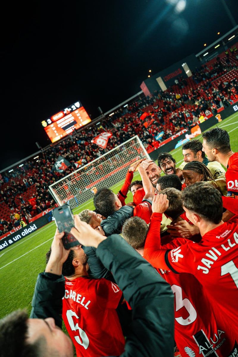 El delantero del Mallorca se marchó felicitado por todos sus compañeros, quienes no dudaron en firmarle su primer balón propio de La Liga EA Sports como reconocimiento de su primer 'hat trick' en la competición española.