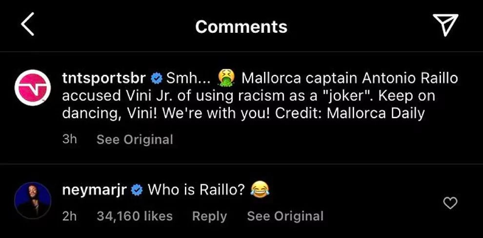 El brasileño respondió en perfecto inglés a la publicación en redes sociales de TNT Sports Brasil que señalaba las palabras de Antonio Raíllo sobre Vinícius Junior con un "Who is Raillo?" lo que traducido es "¿Quién es Raíllo?", mostrando así desprecio o dándole irrelevancia al futbolística del RCD Mallorca.