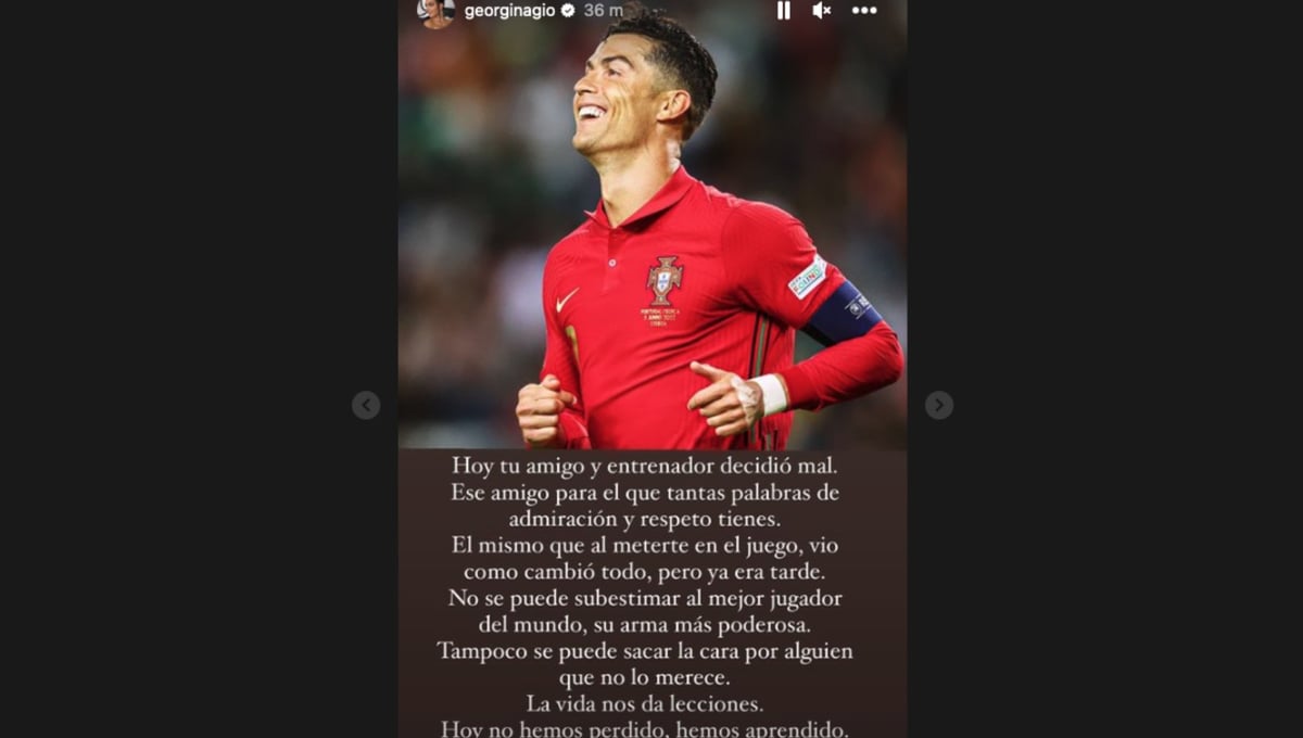 "Tampoco se puede sacar la cara por alguien que no lo merece. La vida nos da lecciones. Hoy no hemos perdido, hemos aprendido", terminó su escrito la española, un texto que acompañó con una imagen de Cristiano Ronaldo con la camiseta de Portugal.