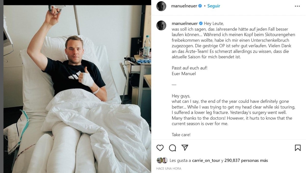 13:20 Tras despedirse del Mundial de forma anticipada, la mala fortuna de Manuel Neuer no ha acabado y según ha desvelado él mismo, se perderá lo que resta de temporada al lesionarse esquiando.