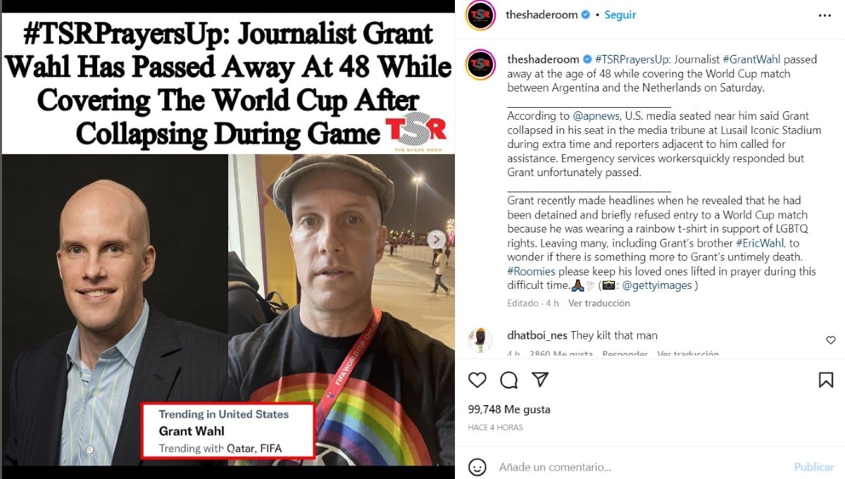 09:15 “Mi nombre es Eric Wahl. Vivo en Seattle, Washington. Soy el hermano de Grant Wahl. Soy gay. Soy la razón por la que él usó la camiseta del arcoíris en el Mundial. Mi hermano estaba sano. Me dijo que recibió amenazas de muerte. No creo que mi hermano acabe de morir, creo que lo mataron”, denuncia a través de su perfil de Instagram el hermano del periodista fallecido en el Países Bajos-Argentina, Grant Wahl.