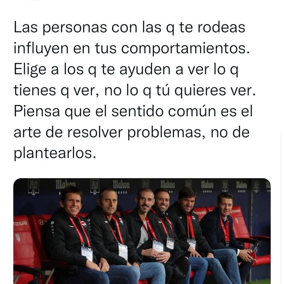 “Las personas con las que te rodeas influyen en tus comportamientos. Elige a los que te ayuden a ver lo que tienes que ver, no lo que tú quieres ver. Piensa que el sentido común es el arte de resolver problemas, no de plantearlos", se apresuró a escribir Casas, que ahora entrena a la selección de fútbol de Iraq, para más tarde borrarlo.