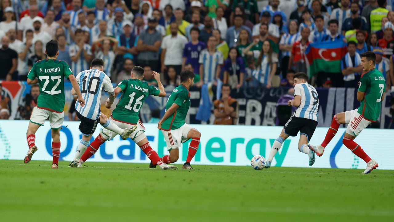 El momento en que Leo Messi le pega de zurda desde la frontal ante Héctor Herrera y Néstor Araújo para hacer el 1-0 de Argentina.UES