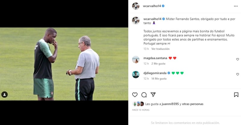Desde entonces, no han sido pocas las muestras de afecto que ha recibido el entrenador portugués y una de ellas como no, ha llegado de un jugador del Betis con el que Fernando Santos ha contado siempre y ha sido importante, William Carvalho. El centrocampista verdiblanco quiso mandar un mensaje de agradecimiento al ya exseleccionador a través de sus redes sociales.