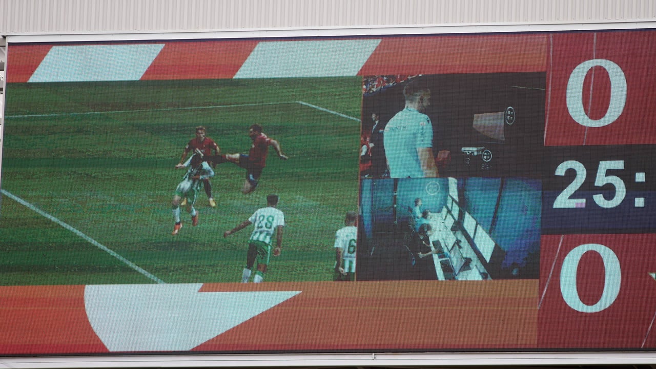 Martínez Munuera le dice que son "tacos en la cabeza" y que el futbolista de Osasuna tiene "la pierna totalmente extendida", a la que García Verdura contesta con una petición extraña, tanto en cuenta la simple revisión de la jugada demuestra la gravedad de la entrada, que no es ni mucho menos intencionada (Moncayola no ve a Miranda), aunque eleva su miembro derecho tanto que no hay otra opción que la roja. Sin embargo, dice que quiere "ver la intensidad" de la patada, por lo que su enlace desde Las Rozas reacciona poniéndole la repetición a velocidad normal a ver si así se convence de lo evidente. Cuando ya su colega dice que va a "cambiar la tarjeta al número 7", en la sala VOR le muestran de nuevo la imagen más nítida, desde la posición del lateral derecho del Betis, donde se observa sin intermediarios el impacto y su gravedad. El resultado ya es conocido.