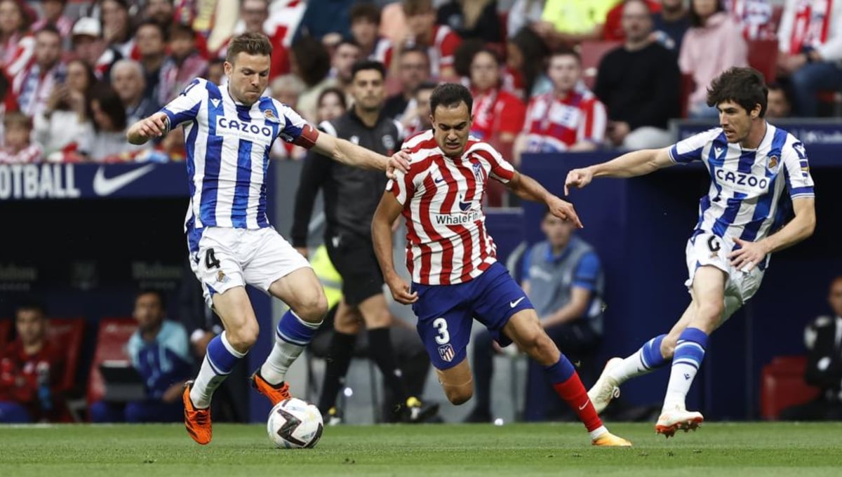Sergio Reguilón disputando un balón con la camiseta del Atlético de MadridUES