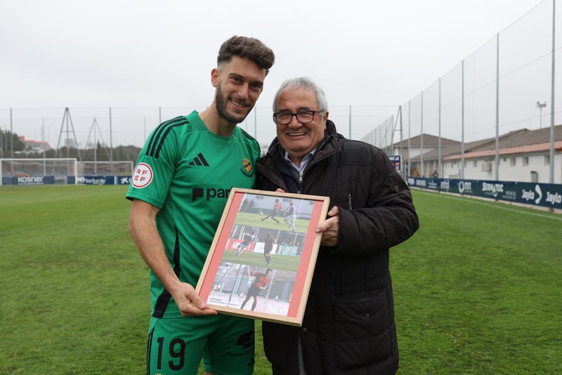El centrocampista de Arre firmó con el club catalán el pasado 3 de febrero, y justo su primer encuentro con la camiseta de los Granas es en Tajonar ante Osasuna. Como no podía ser de otra forma, el club le entregó un obsequio de la mano del presidente de la entidad, Luis Sabalza, reconociéndole tantos años a sirviendo tantos años al servicio del club navarro.
