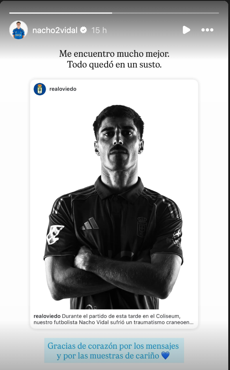 El propio Nacho Vidal recurrió a su cuenta de Instagram para enviar un mensaje de calma a los aficionados del Real Oviedo: “me encuentro mucho mejor, todo quedó en un susto. Gracias de corazón por los mensajes y por las muestras de cariño”. Con estas palabras, el lateral dejó claro que su estado había mejorado y que el incidente no pasaría a mayores.