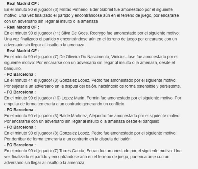 Una pugna entre banquillos que se saldó también con seis amonestados más: Rodrygo, Vinicius y Militao por parte del Real Madrid y Fermín, Balde y Ferran Torres por el Barça.