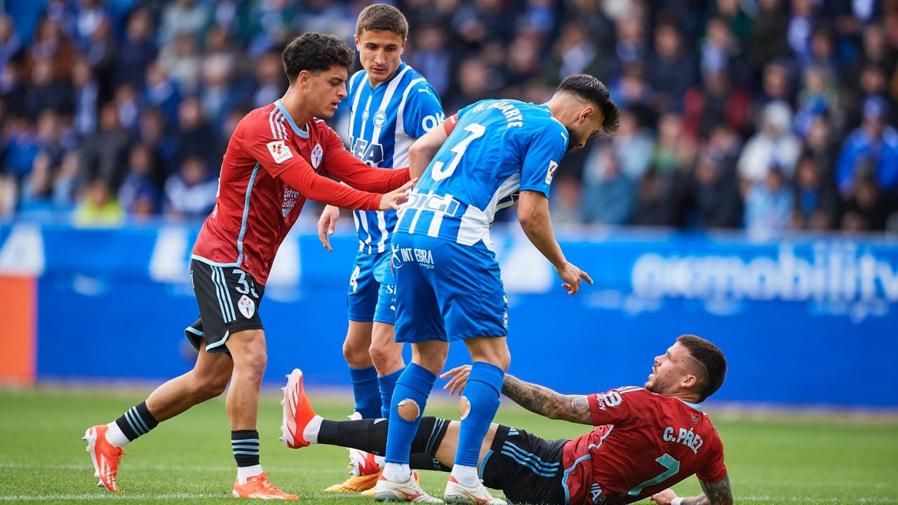 Sivera; Gorosabel, Tenaglia, Duarte (Guevara, min.72), López; Blanco, Benavídez, Guridi (Panichelli, min.89); Giuliano (Rioja, min.89), Carlos Vicente (Sola, min.82) y Kike García (Samu, min.82).Celta de Vigo: Guaita; Mingueza, Carlos Domínguez, Unai Nuñez (Swedberg, min.54); Carles Pérez (Rodríguez, min.81), Jailson, Fran Beltrán, Hugo Álvarez, Manu Sánchez (De la torre, min.54); Iago Aspas y Douvikas (Allende, min.73).