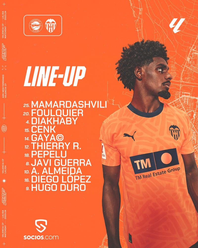 - Valencia: Mamardashvili; Foulquier, Diakhaby, Cenk, Gayá; Thierry, Guerra, Pepelu, López; Almeida y Duro.