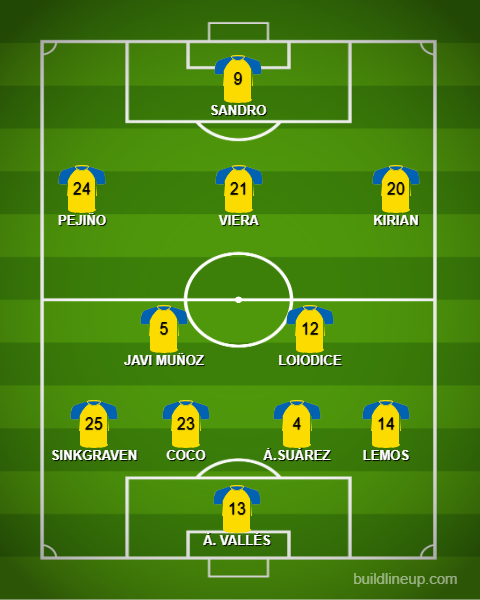 La alineación del equipo 'pío pío' podría estar formada por: Álvaro Vallés; Álvaro Lemos, Saúl Coco, Alex Suárez, Sinkgraven; Javi Muñoz, Enzo Loiodice; Pejiño, Kirian Rodríguez, Viera; Sandro.