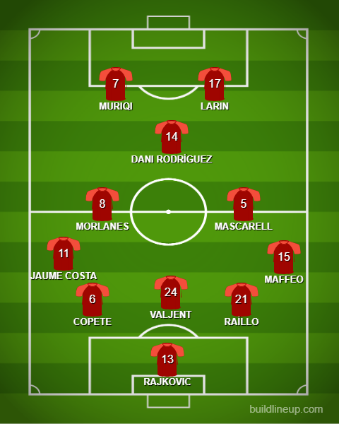 La alineación del Mallorca estaría compuesta por: Rajkovic; Maffeo, Valjent, Raíllo, Copete, Jaume Costa; Morlanes, Mascarell, Dani Rodríguez; Muriqi y Larin.