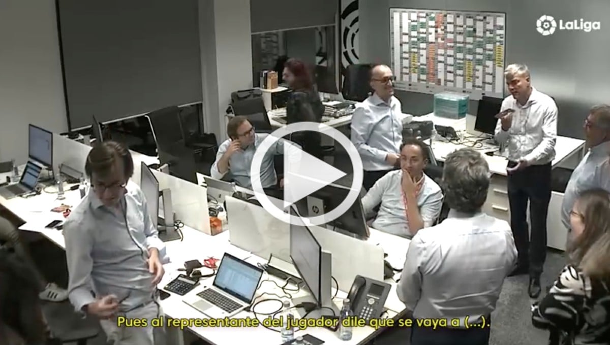 En el vídeo publicado por LaLiga se aprecia como Luis Gil, Director de Competiciones del organismo, recibe una llamada en el que alguien, al otro lado del teléfono, le dice que un representante de un futbolista afirmaba que tenía diez minutos de margen para poder cerrar la operación, y su reacción era la siguiente: “pues al representante del jugador dile que se vaya a…”, mientras que a otra persona se le escucha decir: “No no, no ha entrado y pues ya está”.