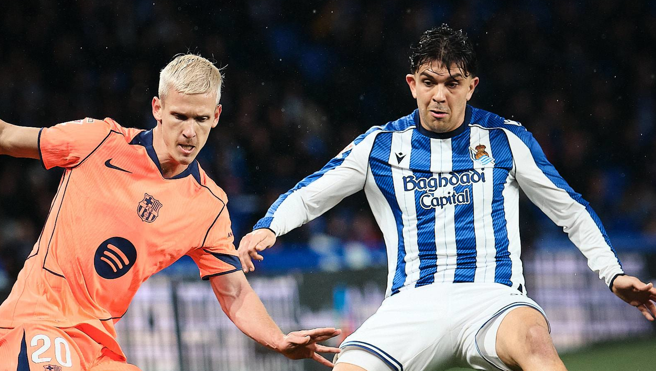 La Real Sociedad, gracias a los goles de Mikel Oyarzabal y Gonçalo Guedes, doblegó este domingo por 2-1 al Barcelona en un encuentro loco en el que el árbitro anuló varios goles por fueras de juego y faltas previas.