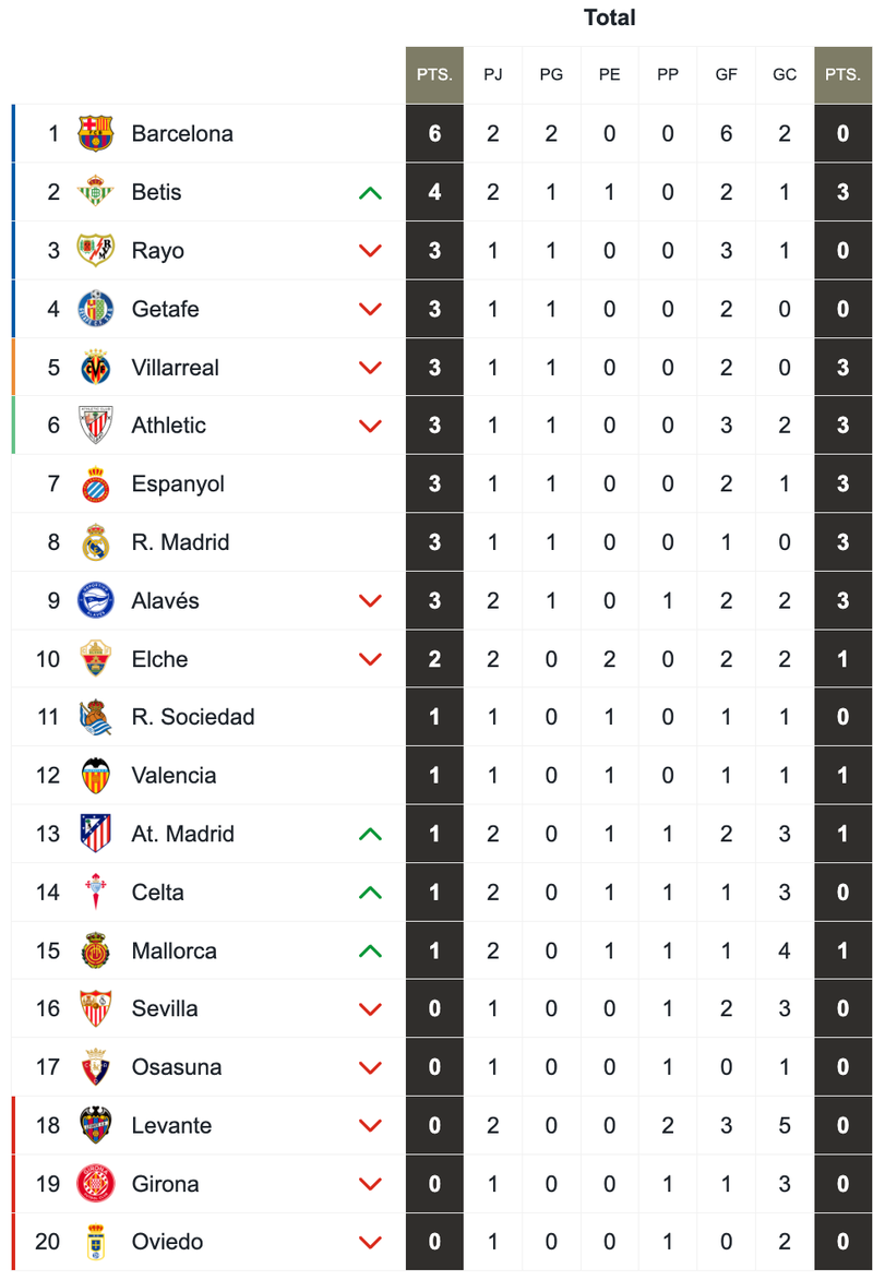 LaLiga EA Sports ya lleva cuatro partidos disputados de la segunda jornada. Este sábado se disputaron el Mallorca-Celta, el Atlético de Madrid-Elche y el Levante-Barcelona