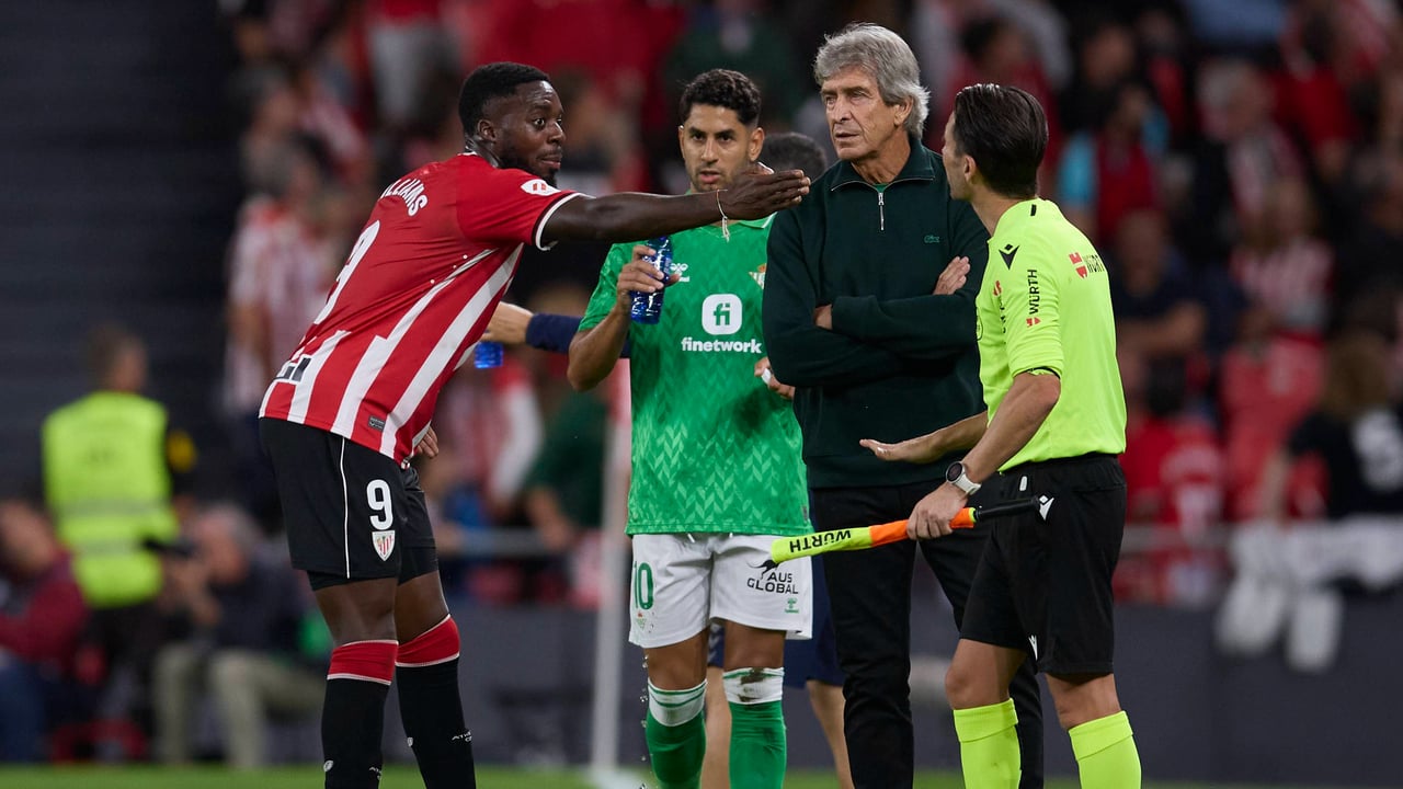 Iñaki Williams protesta al asistente de Soto Grado en presencia de Manuel Pellegrini y Ayoze Pérez durante el último Athletic-Betis.CORDON PRESS
