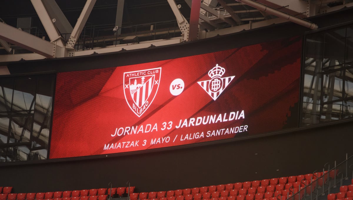 Incidencias: Encuentro correspondiente a la jornada 33ª de LaLiga, disputado en San Mamés ante 43.116 espectadores, con buena representación bética en las gradas.