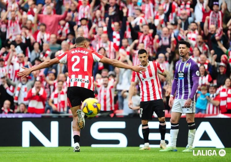 Pero como a perro flaco todo son pulgas, en la jugada siguiente el Athletic hacía el 2-0 tras una acción individual de Nico Williams que acabó poniendo el balón suave pero lejos de los dominios de Hein. Pero el Athletic quería más, los 'leones' olían sangre y quería despedazar a su rival y así lo hicieron en los últimos cinco minutos de la primera parte. Maroan hacía el tercero finalizando un buen centro raso de Yuri desde la izquierda. El ex del Barakaldo se deshacía de su marcador para empujar el balón al fondo de la portería blanquivioleta y estrenarse como goleador rojiblanco. Cuando todo parecía visto para sentencia al descanso, Sancet se sacaba una preciosa volea para hacer el cuarto tras la asistencia de Jauregizar.