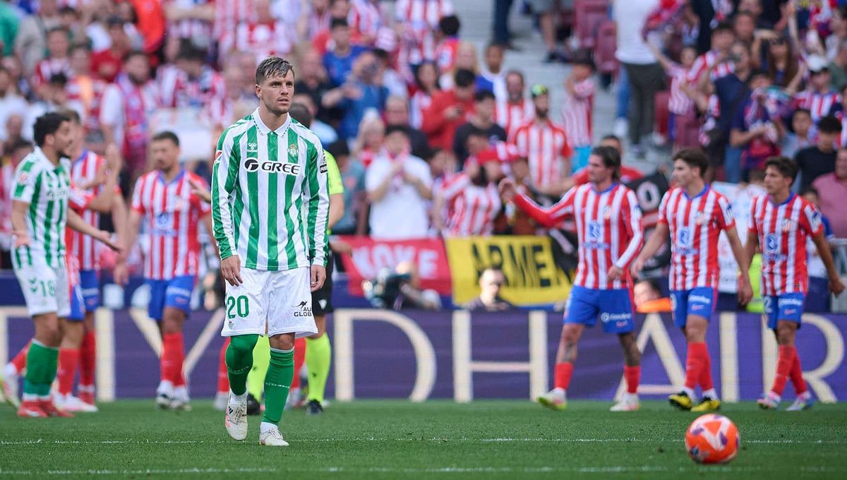 El Betis se despidió de manera abrupta de sus remotas opciones de entrar en Champions tras caer goleado ante el Atlético en un partido en el que resultaba completamente inevitable que tanto Pellegrini como el vestuario pensara en la final de la Conference League. Una realidad que se percibió considerablemente en una primera parte pésima de los verdiblancos solo corregida tímidamente por la bronca del técnico en la pausa de hidratación.