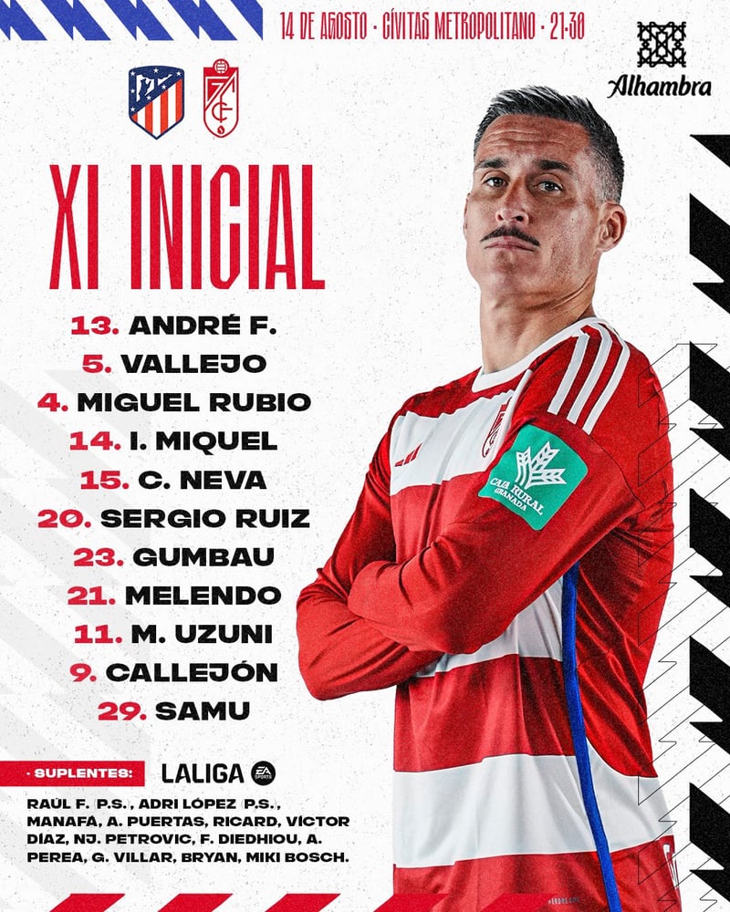 - Once del Granada: André F, Vallejo, Miquel, Miguel Rubio, Neva, Gumbau, Sergio Ruiz, Callejón, Melendo, Uzuni y Samu.