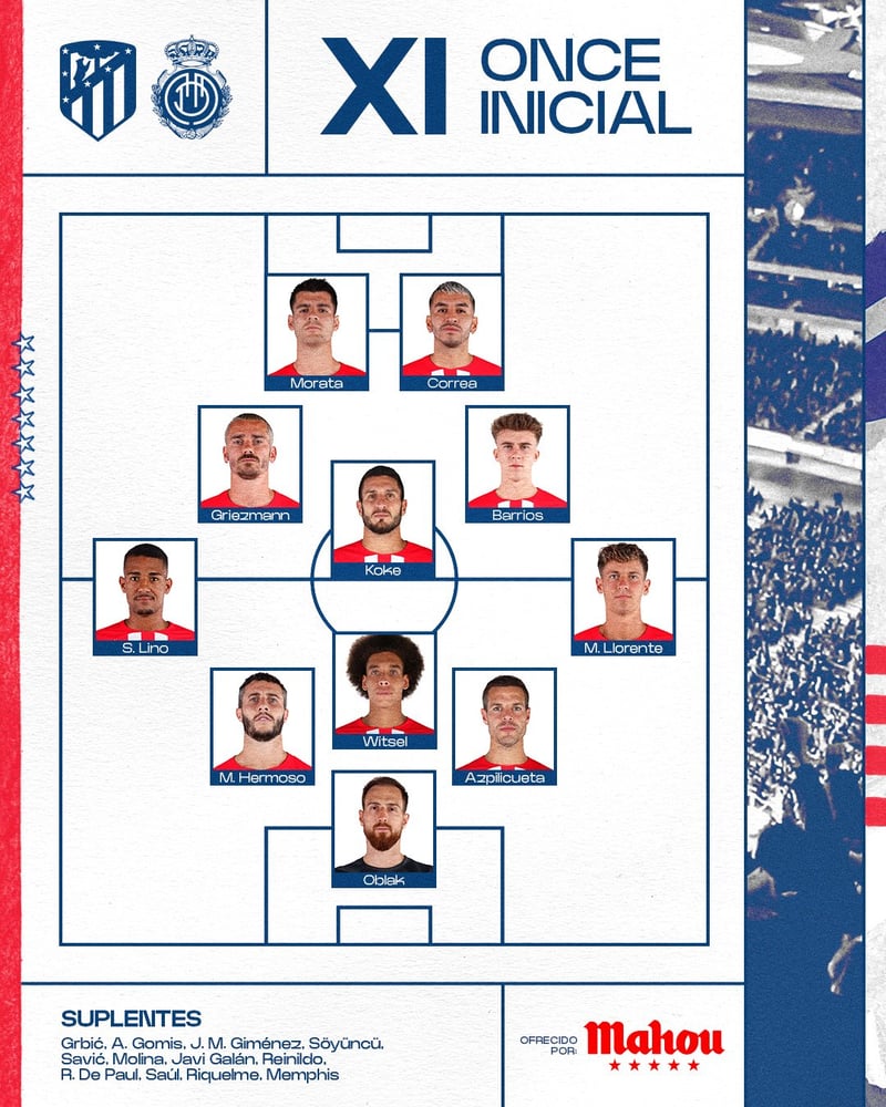 Es lo que se preveía: Morata, Correa y Griezmann en el once titular. Oblak bajo palos ayudado en tareas defensivas por Marcos Llorente, Cesar Azpilicueta, Axel Witsel, Mario Hermoso y Samuel Lino. El centro del campo, para Pablo Barrios, Koke Resurrección y Antoine Griezmann. Dupla delantera para Correa y Morata.