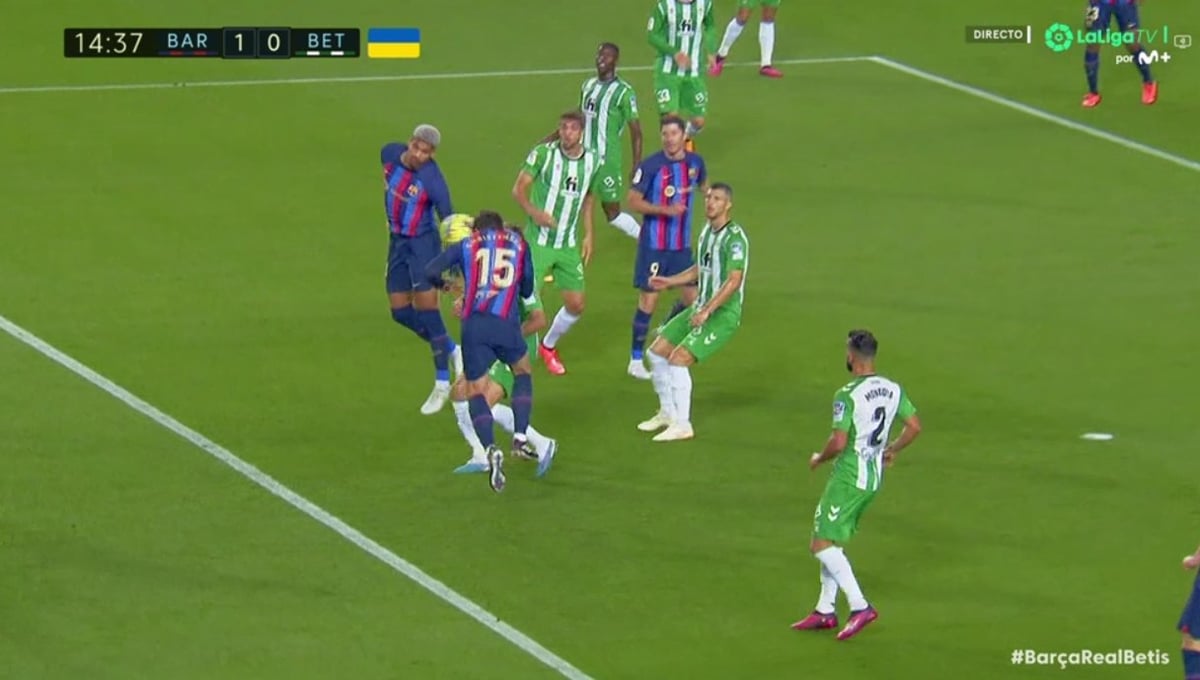 Jugada por dentro del Barça y centro al área de Raphinha que despeja en boca de gol Pezzella. Se queda sentado en el terreno de juego Luiz Felipe, aparentemente lesionado de tipo muscular. Calienta Edgar.